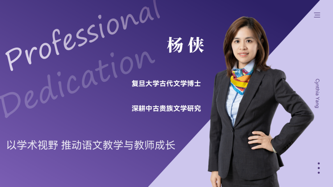 杨侠,复旦大学古代文学博士,深耕中古贵族文学研究。杨老师具备扎实的中考教学经验,曾被评为“闵行区语文骨干教师”。她善于将不同课程体系中对阅读、思辨与写作的共通要求,转化为适合学生发展的教学策略。