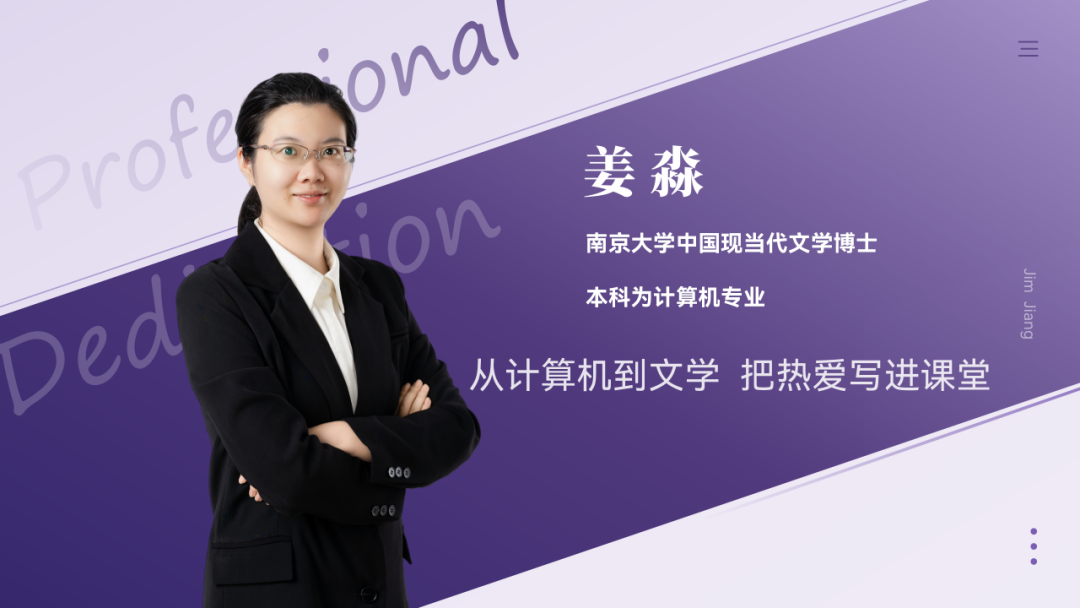姜淼,南京大学中国现当代文学博士,本科为计算机专业。这段跨界经历,让姜老师在现代文阅读、影视文本分析与创意写作中,形成了独特而开放的教学视角。