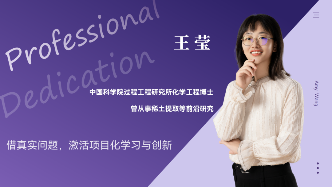 王莹,中国科学院过程工程研究所化学工程博士,曾从事稀土提取等前沿研究。在中考化学教学与自招指导之外,王老师还专注于理科类项目化学习与科创课程设计。