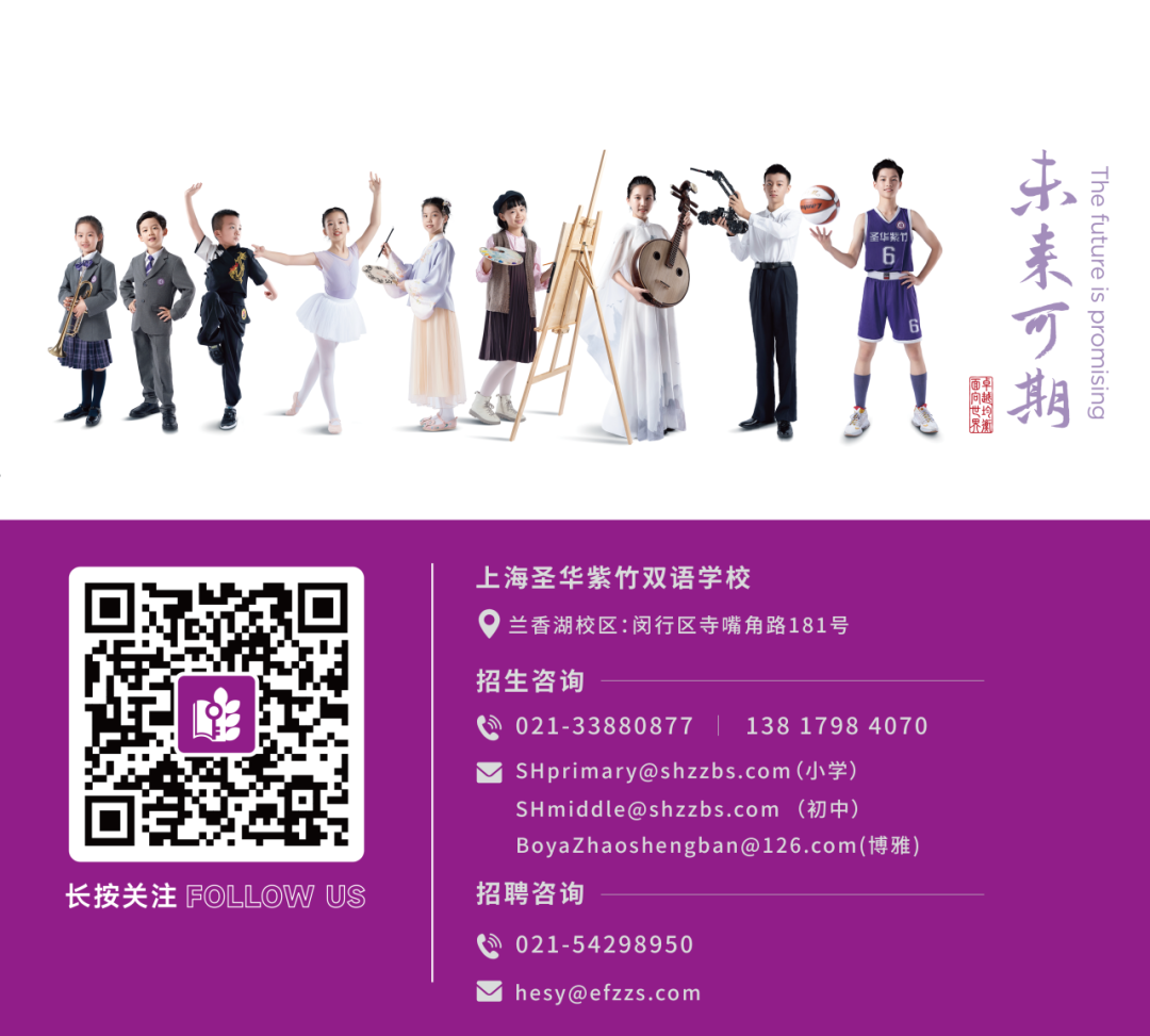 上海民办圣华紫竹双语学校是一所致力于多元课程与发展通道的九年一贯制民办学校。以”一切以学生为出发点”为办学宗旨,致力于构建多元课程体系与发展通道。学校秉持”以学术为核心的全人教育”理念,通过中英双语特色教学,注重学术能力与个人成长的协同发展。在这里,”人人有舞台”的教育实践与”诚信快乐”的校园文化相得益彰,课程多元生动、教师专业专注。学校致力于打造学术与品质、志趣与专长均衡发展的多彩校园,为孩子们终生学习和发展奠定坚实的基础。 SHZS is a nine-year-through school committed to providing diversified curricula and developmental pathways. Stick to the value of “always student-first”, We create a stage where “every individual shines” through our core values of “holistic education with academic excellence,” offering an opportunity to all students from diverse background with different choices, so as to meet their various interests and needs.